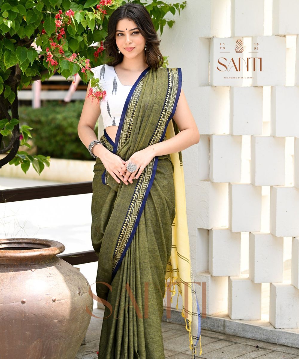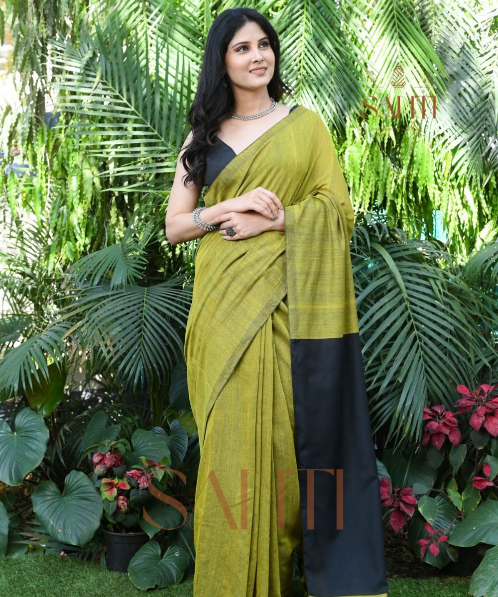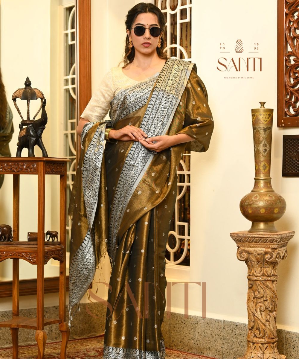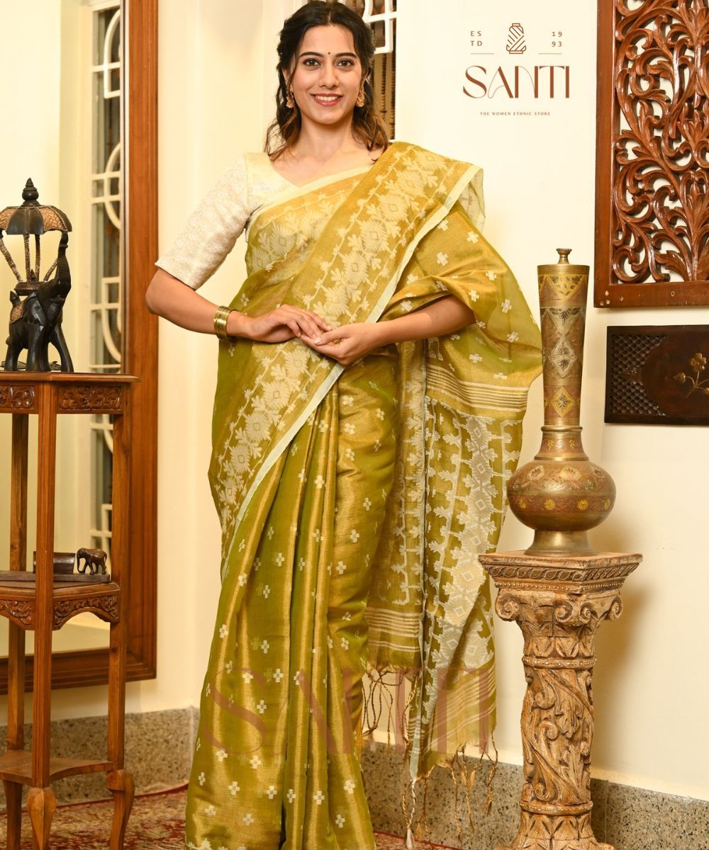 Olive Gold Tissue Silk Saree with Silver Jamdani Border