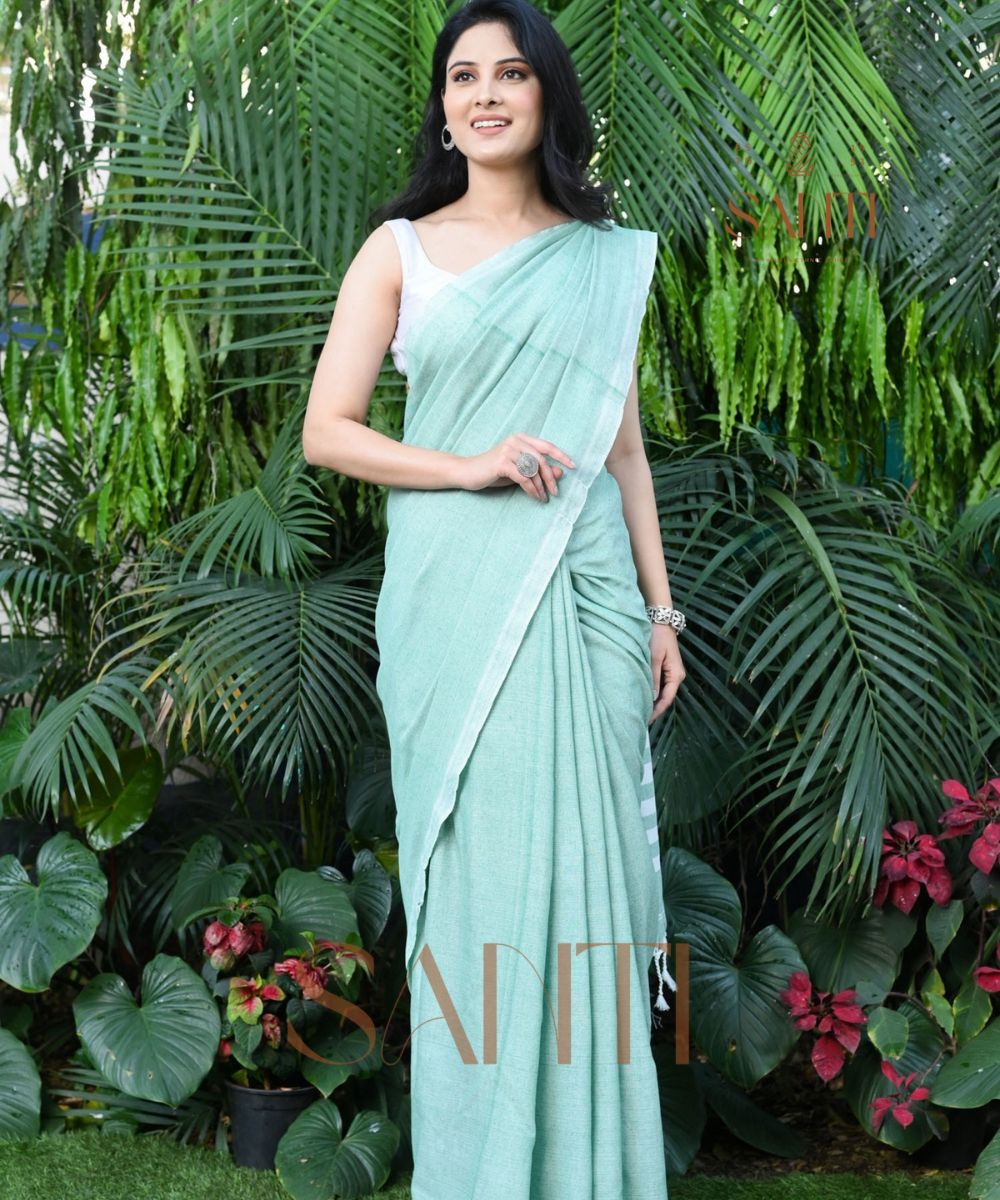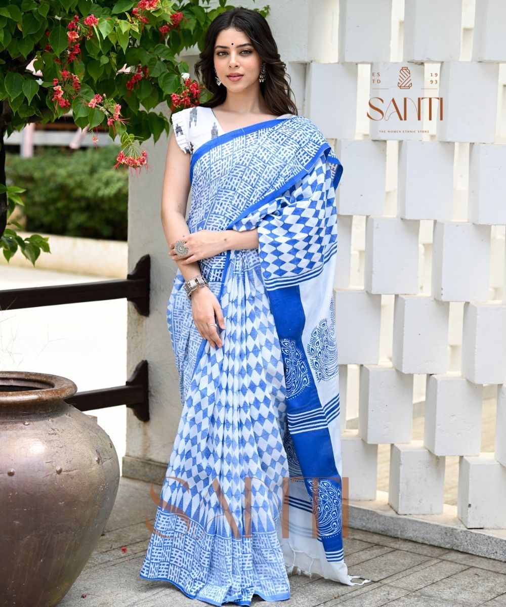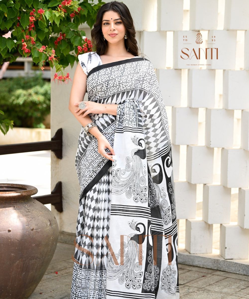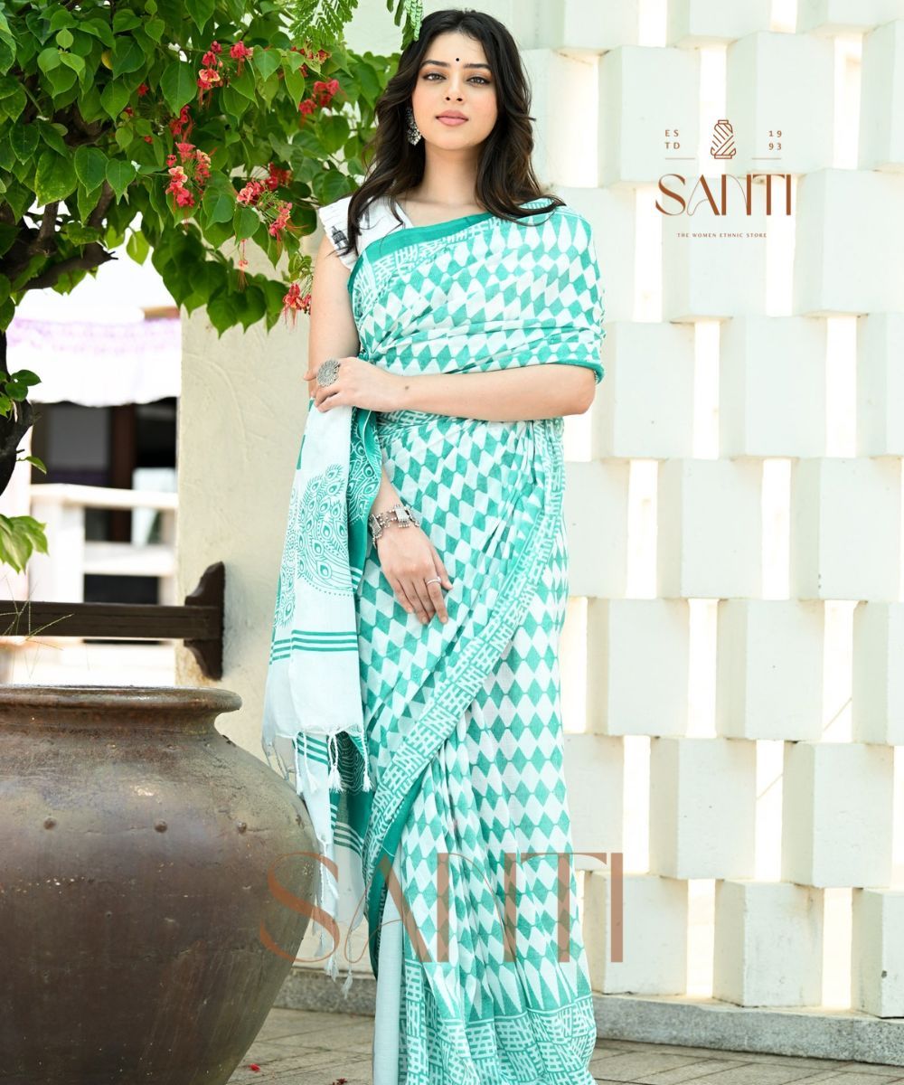Teal Green & White Cotton Printed Saree with Peacock Motif