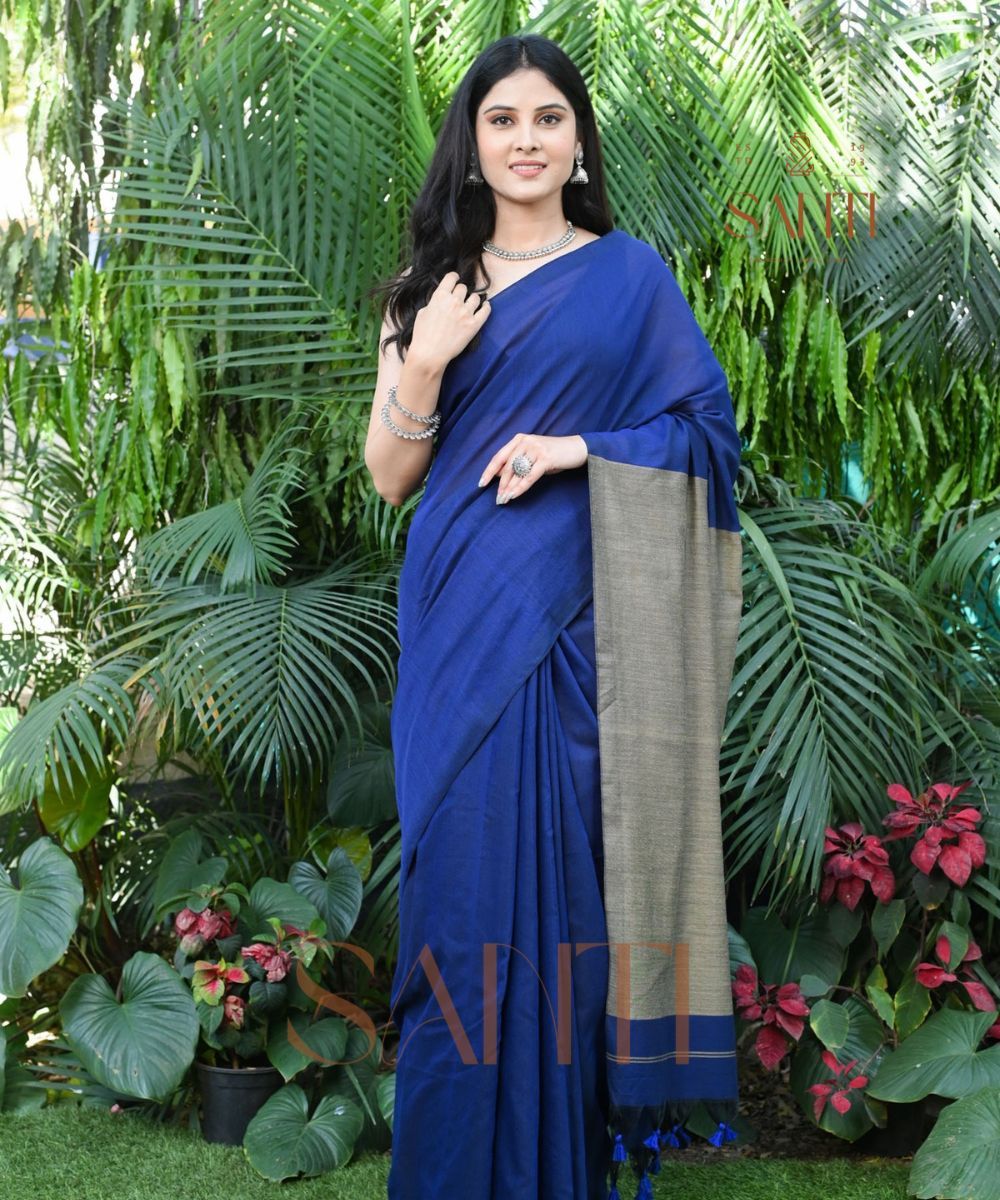 Royal Blue Cotton Saree with Contrast Beige Pallu